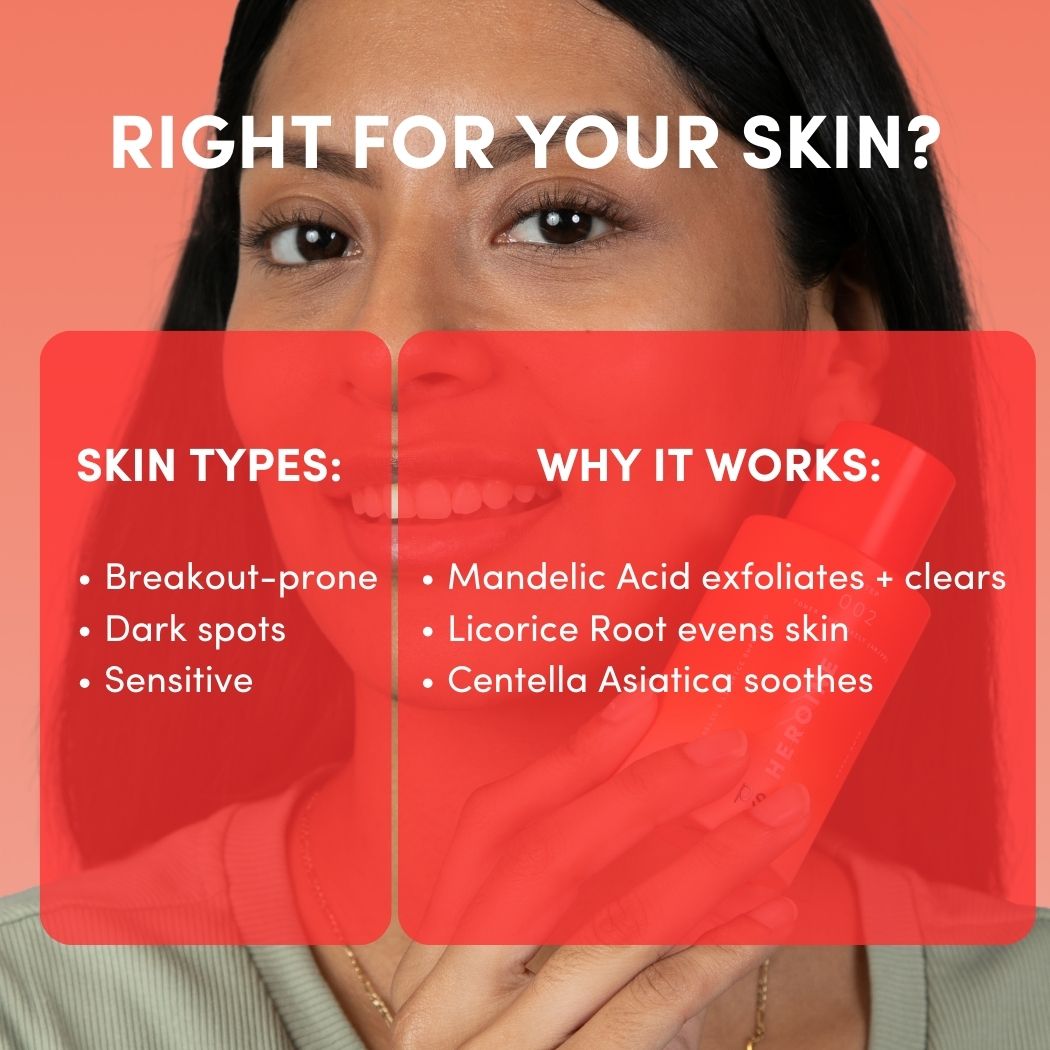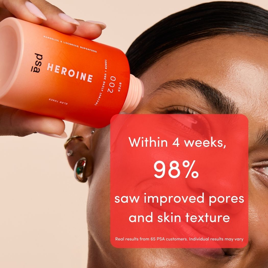HEROINE not only saves the day but also your skin. Our Mandelic & Licorice Superfood Glow Toner is a must-have for skincare aficionados. This exfoliating toner uses mandelic acid to remove dead skin layers, boosting the effectiveness of your favorite moisturizers and serums. It tightens and clears pores, giving you a clearer, more radiant complexion that glows.