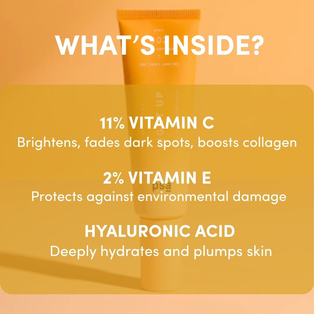 11% Vitamin C, 2% Vitamin E, Grapeseed Oil, Hyaluronic Acid, Glycerin